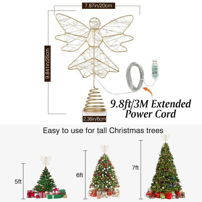 - 🌟 Premium Material: Made of high-quality iron wire with spring base, it is strong and durable, and can be attached to your Christmas tree top. Shaped by delicate angel, it is novel and elegant, which looks very attractive at night. 9.8ft cable is long enough for you to place it anywhere you like.