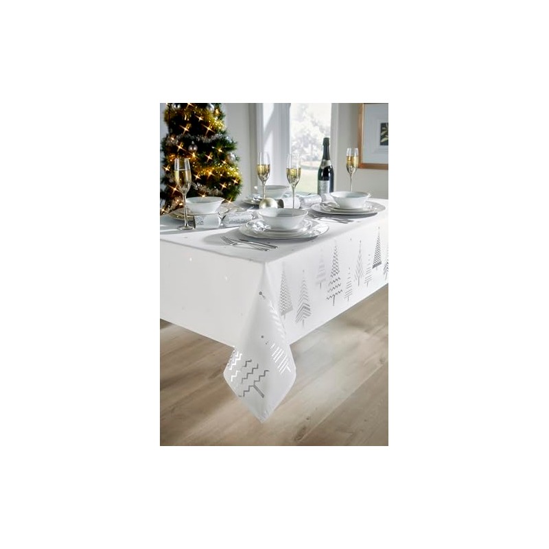 Lex's Linens Christmas Tablecloth Crisp White Background with Silver Lurex Christmas Tree print (52” x 90” Tablecloth)
