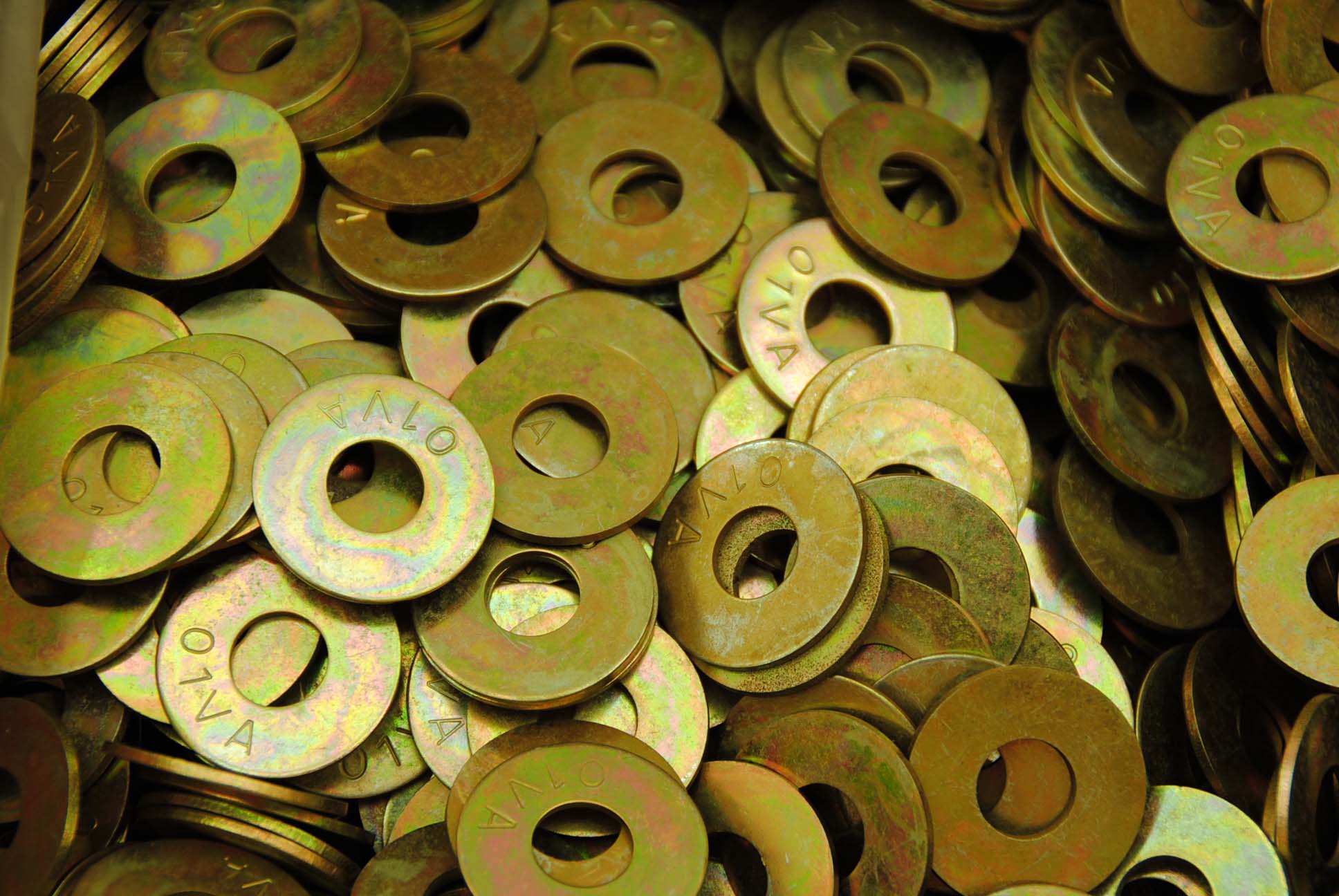 Lot of (300) hardened 7/16" USS yellow zinc plated flat washers.