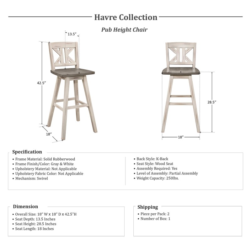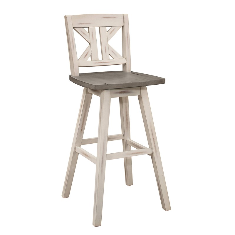 Creating a subtle rustic look for your dining space is the Havre Collection. A white sand-through finish graces the solid rubberwood 29-inch divided X-back swivel counter height chair, highlighting the veneer.
