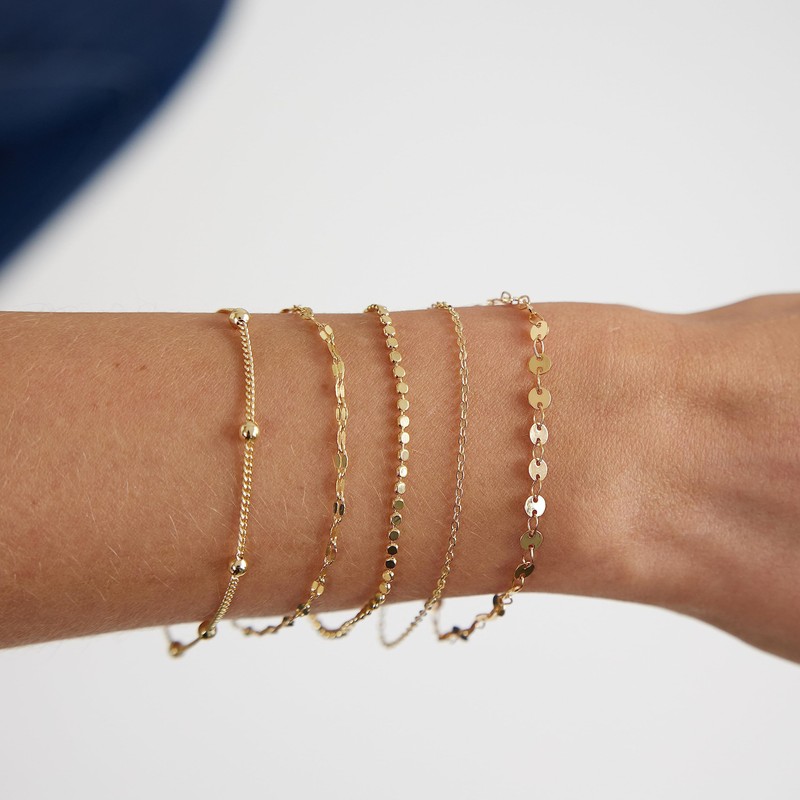 - ♚【5 Pcs GOLD BRACELETS SET】: Set contains: ①Bead Bracelets ②Lip Chain Bracelets ③Dot Link Bracelets ④O Chain Bracelet ⑤Disc Bracelet.These bracelets are suitable for layering as well as being worn alone.