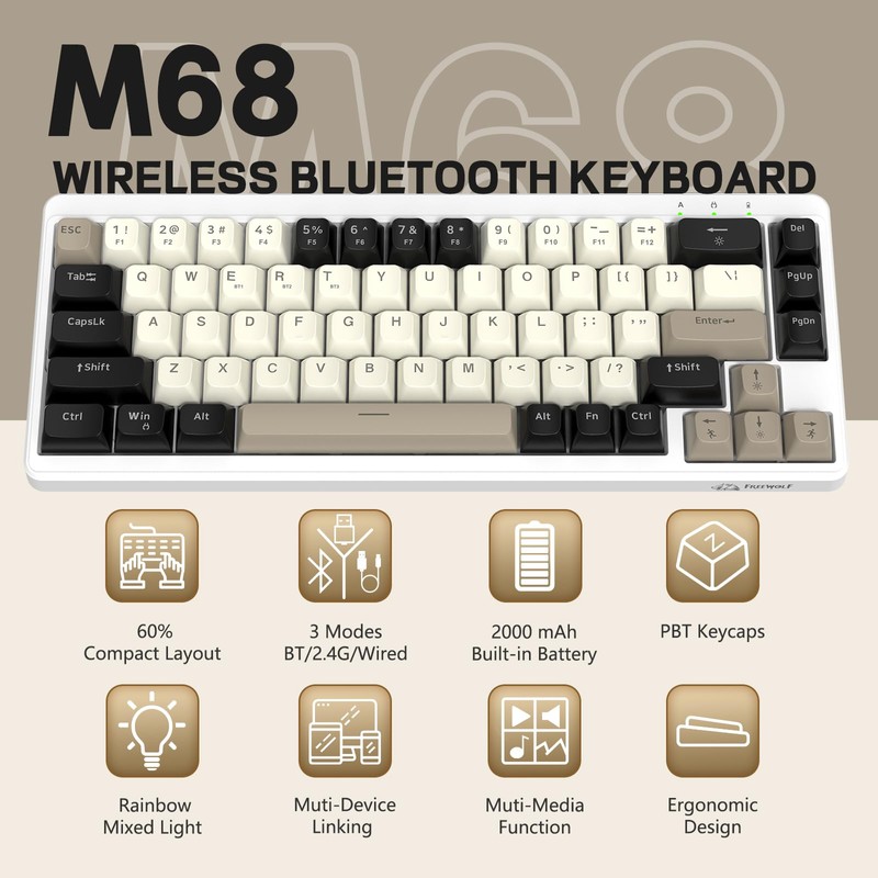 LexonElec X FREEWOLF M68 65% Wireless Gaming Keyboard, QWERTY Layout, BT/2.4G/Wired Silent Membrane Keyboard, Rainbow Backlit 67 Keys PBT Keycaps, 2000mAh Portable for Gamer/Office - Creamy
