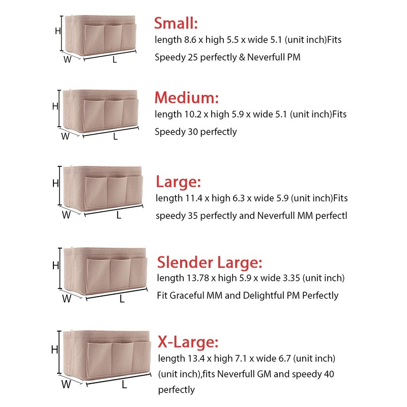 - Small:length 8.6 x high 5.5 x wide 5.1 (unit inch)Fits Speedy 25 perfectly & Neverfull PM; Medium:length 10.2 x high 5.9 x wide 5.1 (unit inch)Fits Speedy 30 perfectly;Large:length 11.4 x high 6.3 x wide 5.9 (unit inch)Fits speedy 35 perfectly and Neverfull MM perfectl; Slender Large:length 13.78 x high 5.9 x wide 3.35 (unit inch)Fit Graceful MM and Delightful PM Perfectly; X-Large:length 13.4 x high 7.1 x wide 6.7 (unit inch)(unit inch),fits Neverfull GM and speedy 40 perfectly