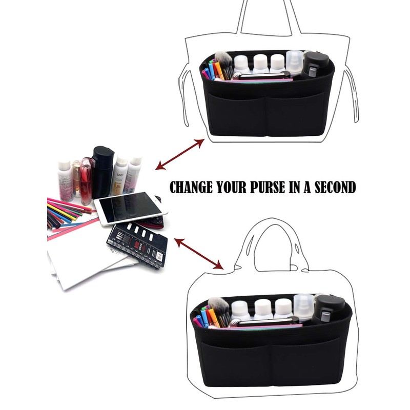 - REMOVEABLE HOLDER INSERTS AND KEY CHAIN: 11 Pockets Total Purse Organizer,3 exterior pockets, 8 interior pockets with two removerable solid hoder inserts side which can keep the bottles with liquids remain upright.with a big inner pocket which can keep some valuable articles. Extra detachable long felt keys chain help find the keys easily.