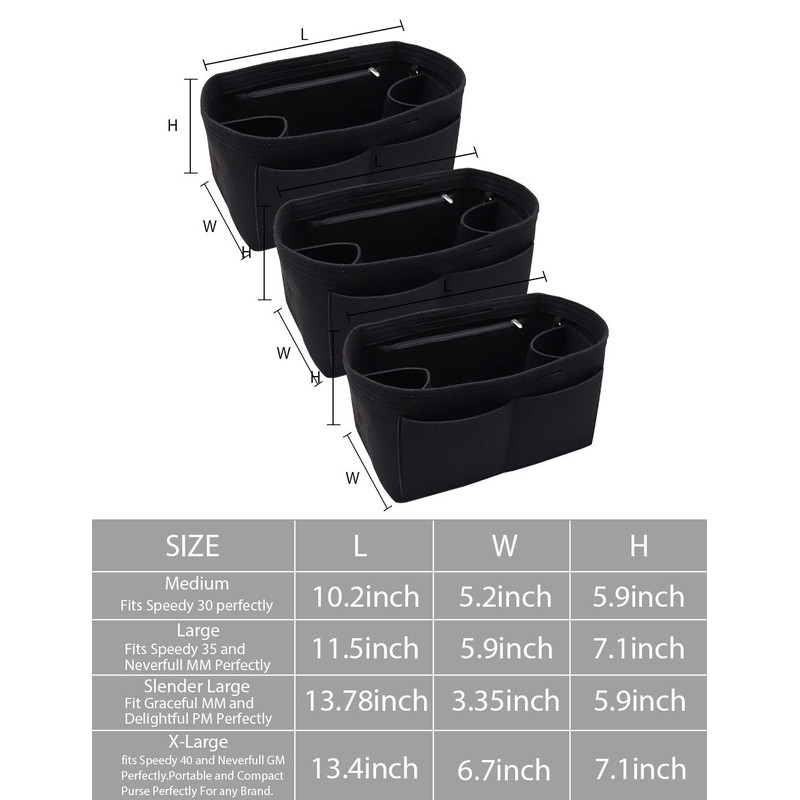 - SIZE OF BAG ORGANIZER-Medium: 10.2(L) x 5.2(W) x 5.9(H) inches Fits Speedy 30 perfectly; Large: 11.5(L)x 5.9(W) x 7.1(H)inches Fits Speedy 35 and Neverful MM Perfectly;Slender Large: 13.78(L)*3.35(W)*5.9(H)Fit Graceful MM and Delightful PM Perfectly;X-Large:13.4(L)*6.7(W)*7.1(H)inches fits Speedy 40 and Neverful GM Perfectly.Portable and Compact Purse Perfectly For any Brand.