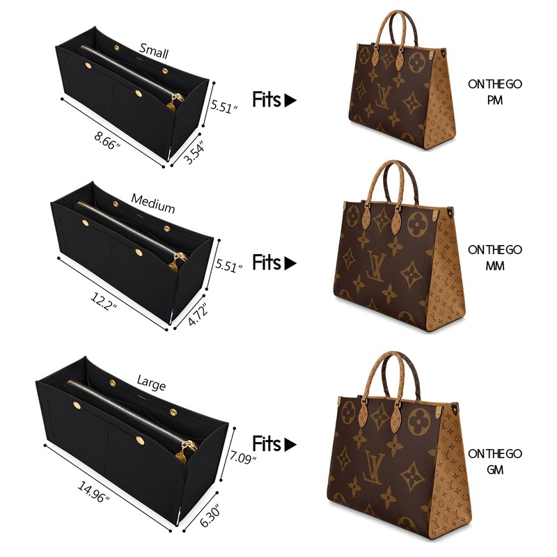 - ❤️DIMENSIONS: Specially designed for ONTHEGO PM MM GM, Small:8.66(L)x5.51(H)x3.54(W)inches,Wieght 0.22lb,Perfect for ONTHEGO PM, Medium:12.2(L)x5.51(H)x4.72(W)inches,Wieght 0.3lb,Perfect for ONTHEGO MM, Large:14.96(L)x7.09(H)x6.3(W)inches,Wieght 0.37lb,Perfect for ONTHEGO GM.Please use a tape measure to measure the inner width,height,Deep of the handbags, then compare the size chart and purchase.
