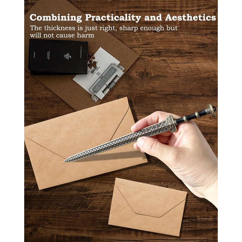 • High-Quality Construction- Crafted from durable zinc alloy with antique bronze plating, this decorative letter opener features authentic sword detailing that resists tarnishing. The weighted handle provides perfect balance while the blunt edge ensures safe envelope opening.