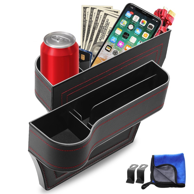 LEYACS Car Seat Gap Filler, Premium Leather Car Seat Gap Filler Organizer with Cup Holder, Car Seat Organizer with Two Seat Hooks, Can Hold Cell Phone, Keys, Cards, Canned Drinks - 2 Pack, Black