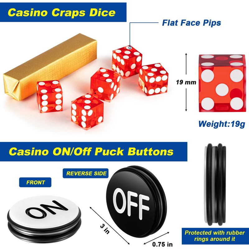 - Abundant Craps Package: slide into the captivating world of craps with a comprehensive craps set that includes 1 craps mat with a convenient carrying bag, 100 poker chips in a clear case, 1 craps stick, 5 right angled craps dice, and 1 ON/OFF puck. This comprehensive set is ideal for most levels of player and makes a nice gift too