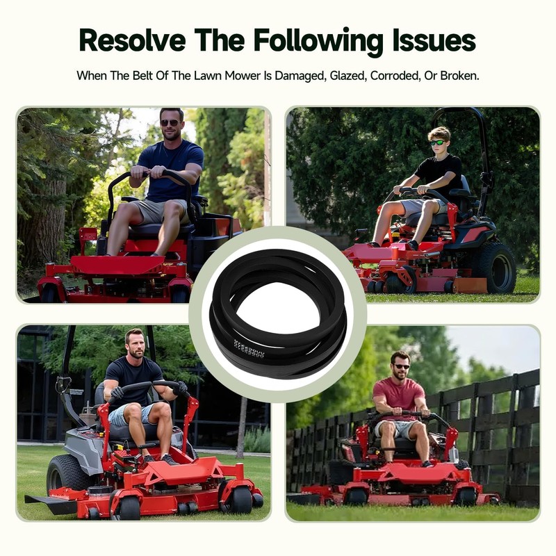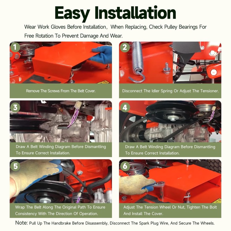 - 【Installation Precautions】: Replace lawn mower belts immediately if sidewall is damaged, glazed, eroded, or broken. When replacing, check pulley bearings for free rotation to prevent damage/wear. Wear gloves before installation. Measure old belt size before purchase. Contact us with questions