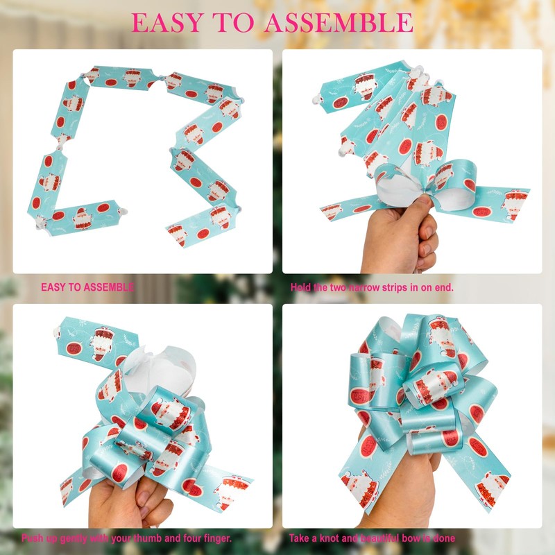 - EASY TO USE: Just pinch the 2 drawstrings inside the ribbon with your one hand, and pull the end of the 2 drawstrings with your another hand, just a few seconds, a beautiful gift bow will be made. Tie the strings when finished, then tie a knot to secure the bunch, and you can attach the bows to presents.