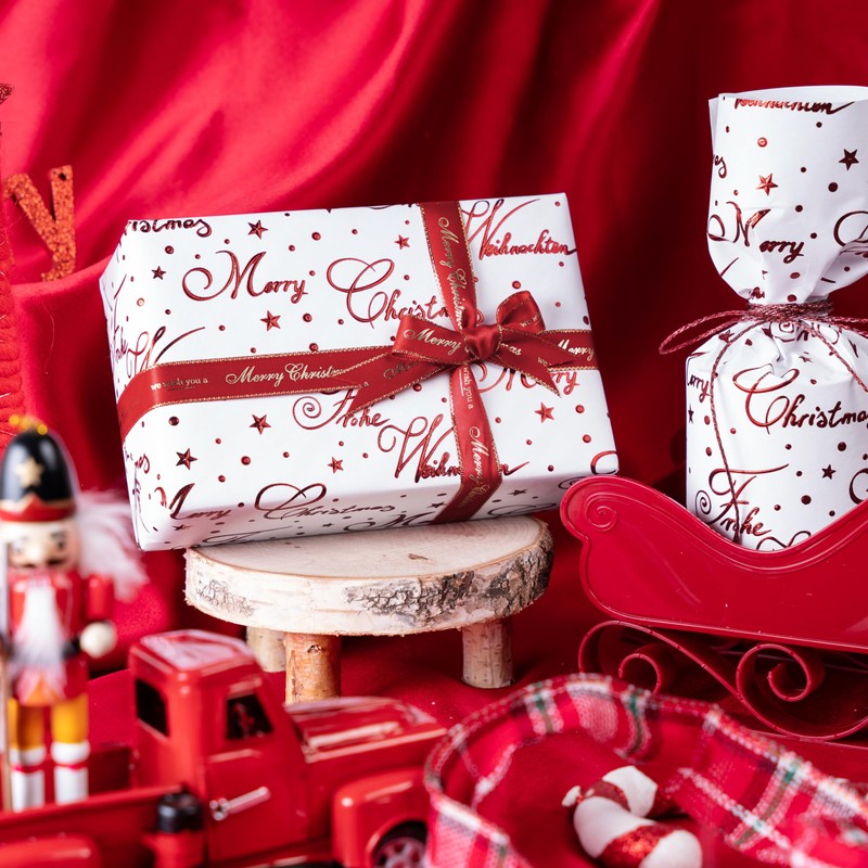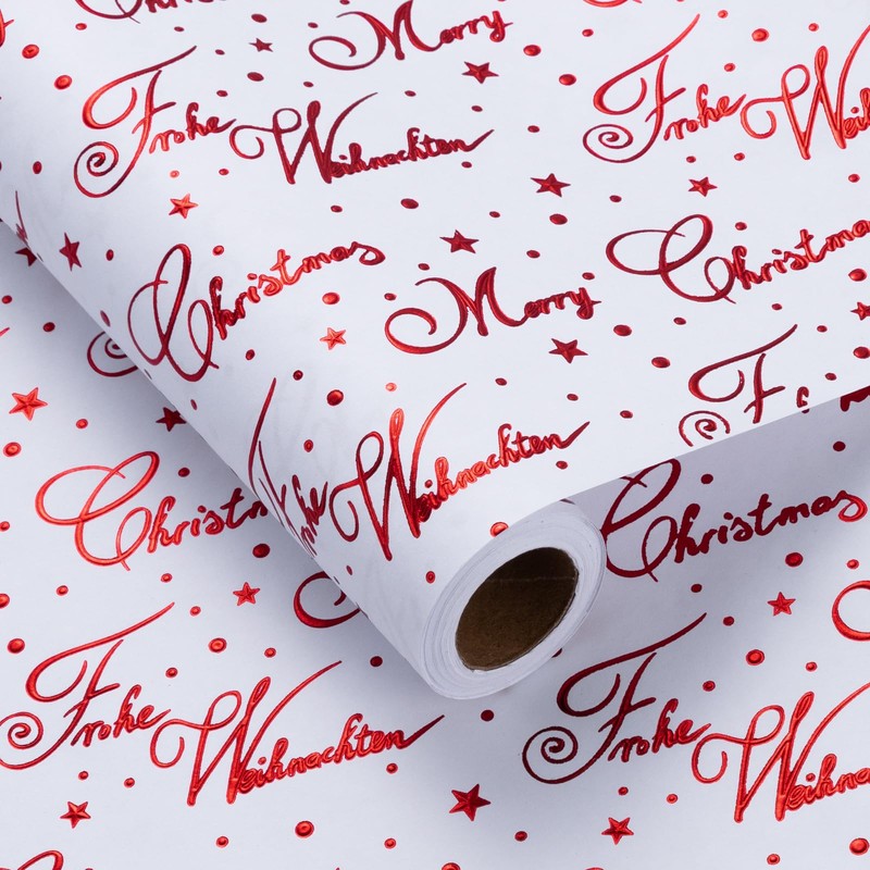 - EXQUISITE CRAFTSMANSHIP: This white wrapping paper is elegantly adorned with a star and dot pattern, highlighted by red "Merry Christmas" and "Frohe Weihnachten" text, offering a three-dimensional, festive touch that adds a sophisticated and stylish look to your holiday gifts.