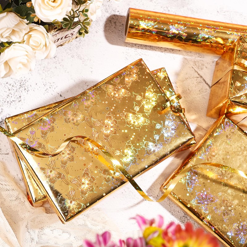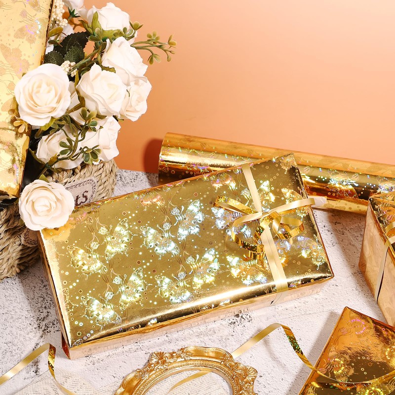 - HOLOGRAPHIC FOIL: The holographic foil wrapping paper is printed with butterfly in gold as shown in the picture. The color of the pattern will change under the light or viewed from different angles, making the gift more gorgeous.