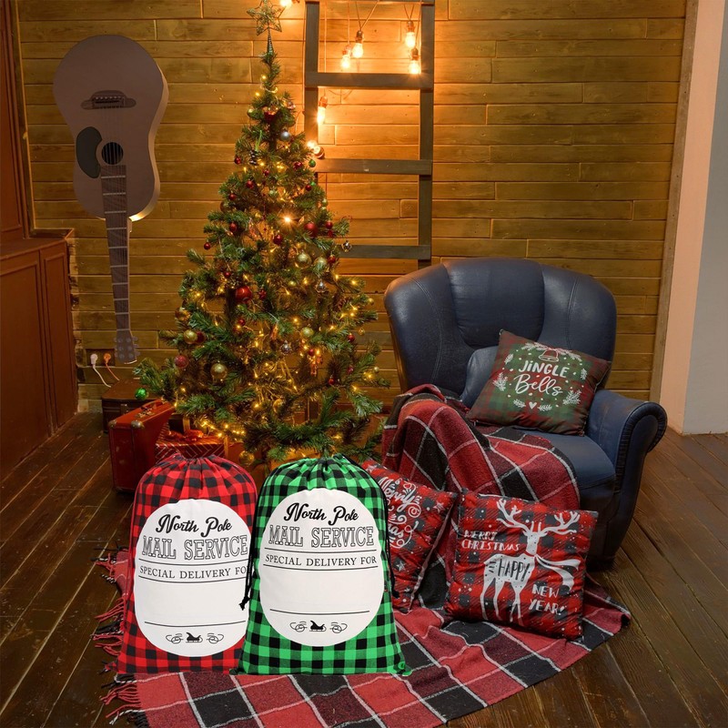 Leziazany Santa Sack 2 Pack Christmas Buffalo Plaid Canvas Santa Bag with Drawstring Xmas Personalied Gift Bag Extra Large Christmas Sacks Size 27.5"x19.5"(Red green Plaid)