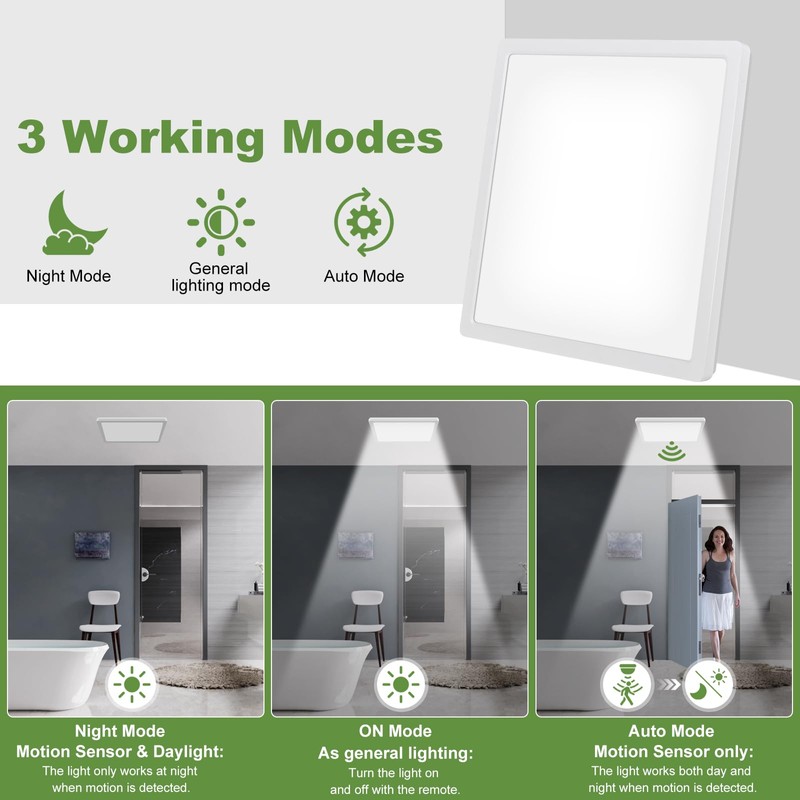 - ??Verschiedene Sensormodi??Sie k?nnen diese Sensor Deckenleuchte noch Ihrem Bed??rfnis via Fernbedienung einstellen: 1. "ON" Mode ohne Sensor: Dr??cken Sie "ON", Immer an als normal Lampe; 2. "Reset-Modus??: Dr??cken Sie "Reset", Das Sensor Licht bleibt (1,5m + 50Lux + 30s); 3. "Bewegungssensor + Lichtsensor": Diese lampe funktioniert tags??ber nicht, kann nur Nachts durch Bewegung aktiviert werden; 4. "Nur Bewegungssensor": Lichtsensor Disable und Leuchte mit Bewegungsmelder funktioniert ganzt?gig.