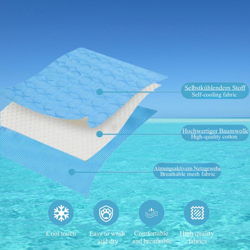 Material The LEZUAN dog cooling mat is made of 3 layers: self-cooling fabric, high quality cotton and breathable mesh. It uses safe and non-irritating fibres and is lighter, thinner, breathable and comfortable compared to ordinary moisture-resistant fabrics and makes pet cooling. This dog cooling mat is perfect for keeping your pet cool and comfortable in hot weather.