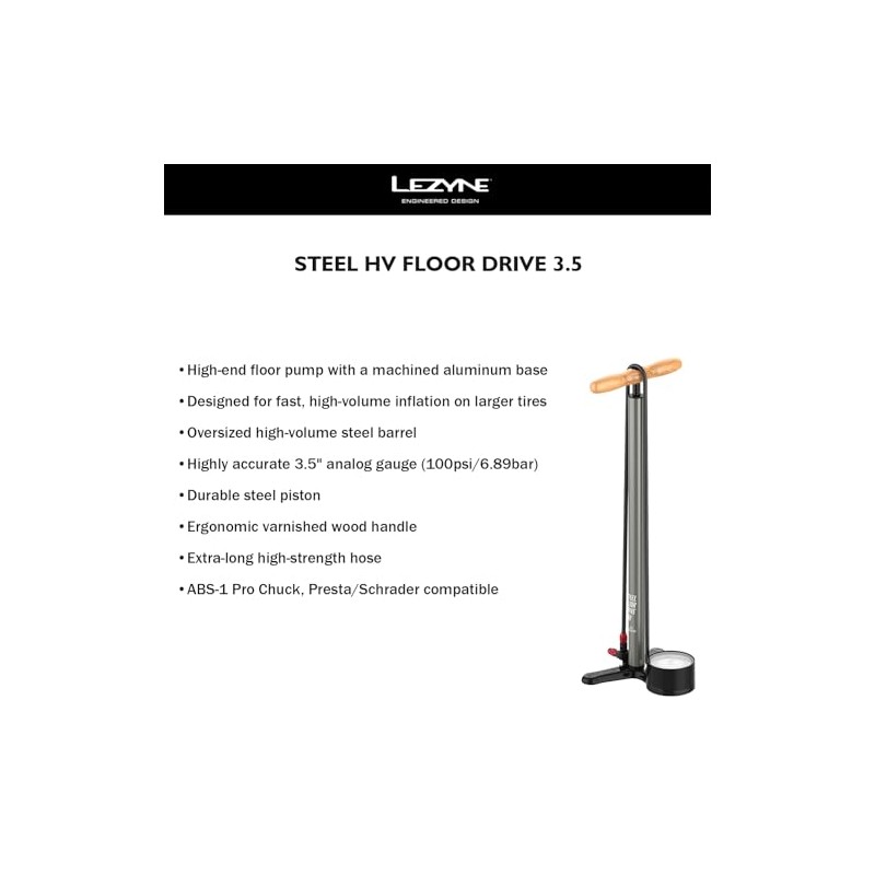 - TOP-QUALITY BIKE PUMP - The Steel HV Floor Drive 3.5 from Lezyne is a high-end bicycle floor pump designed for fast, high-volume inflation on larger tires; It combines precision engineering with high performance, making it an essential tool among bike accessories; This air pump allows for quick and efficient tire inflation, saving you time and effort
