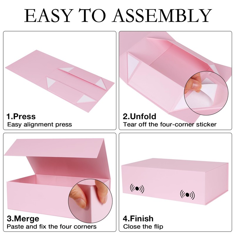 • Easy to assembly: these collapsible boxes are easy to set up, requiring no extra tape. Just peel off the protective film from the four corners and press by hand for a few seconds to secure and shape the box