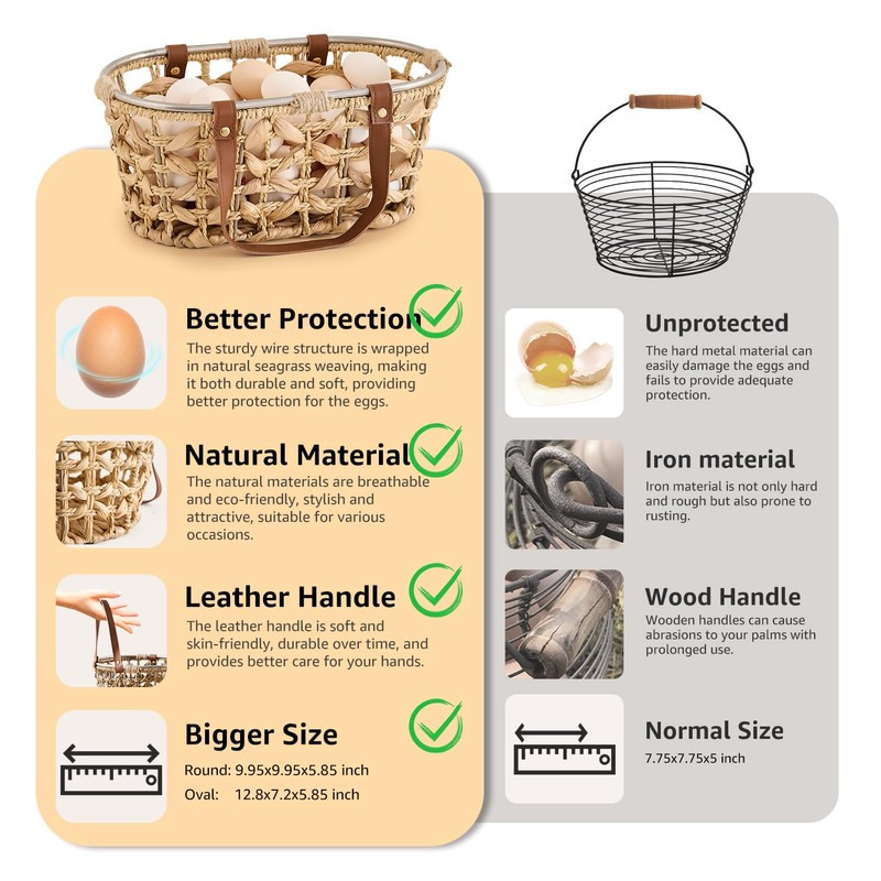 - Egg Basket for Gathering Fresh Eggs: LGENHOOM wicker egg basket is made of natural seagrass. The natural seagrass material protects the eggs and offers excellent breathability. It can be used as an egg collecting basket, gathering basket, harvest basket.