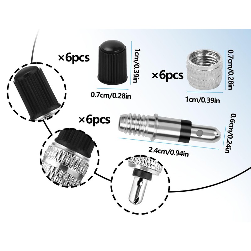 - [Bicycle Valve Set]: This set contains 6 sets of bicycle valves, 3 accessories for one valve. The 3 accessories include: 1 core + 1 plastic cap + 1 compression nut, providing a comprehensive solution for your cycling plan. Whether you are a mountain biker, road cyclist or city cyclist, with this package you are in good hands.