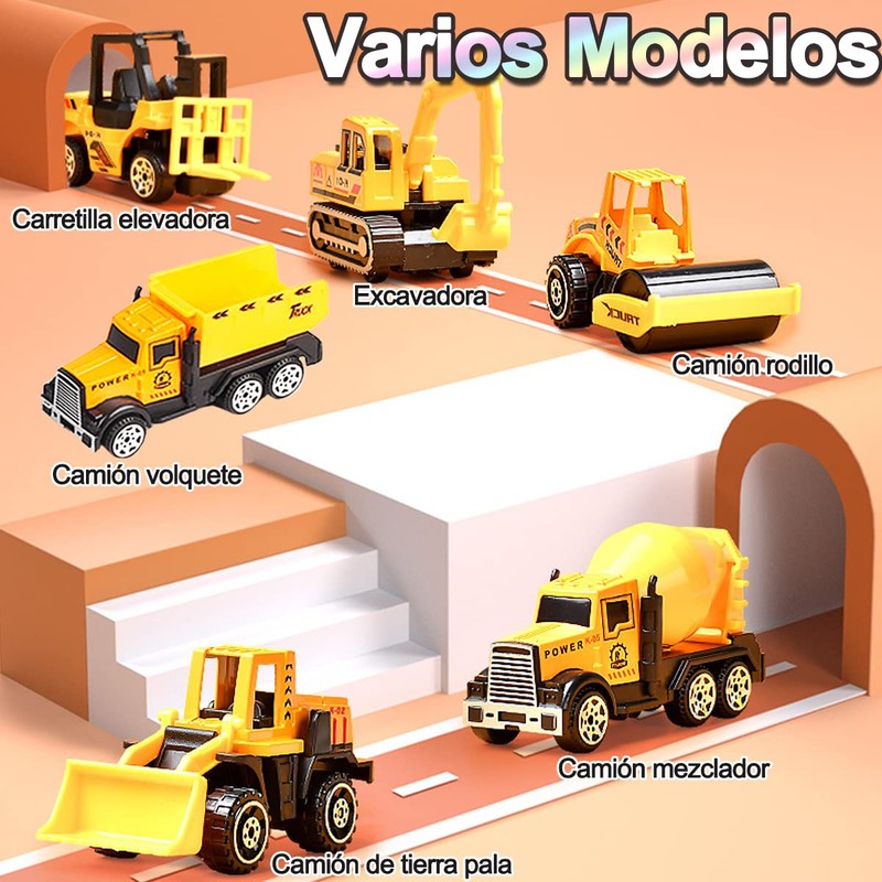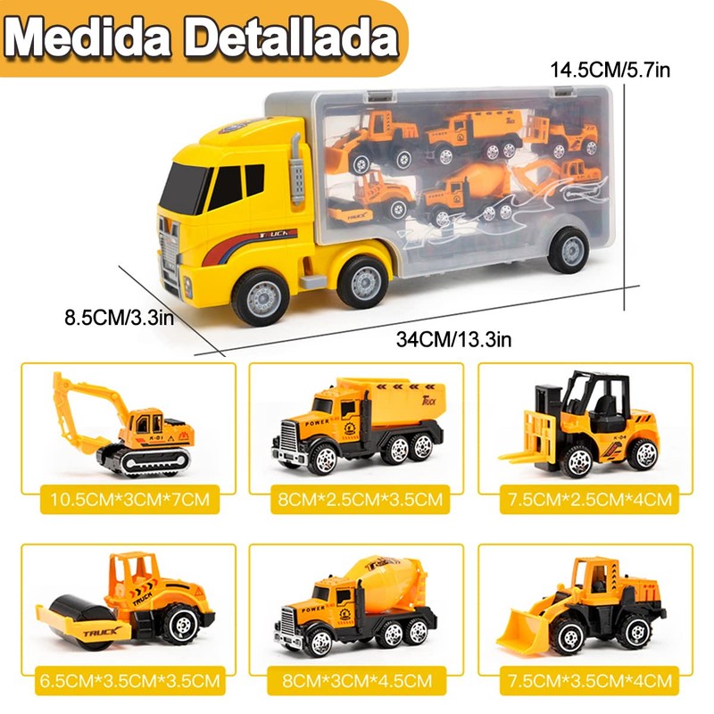 - 🚚【7 en 1 Juego de Vehículos de Construcción】: 6 Mini vehículo de construcción en diferentes diseños y 1 estilo único Vehículo de transporte: excavadora, bulldozers, rodillos, camiones hormigonera, carretillas elevadoras, volquetes.