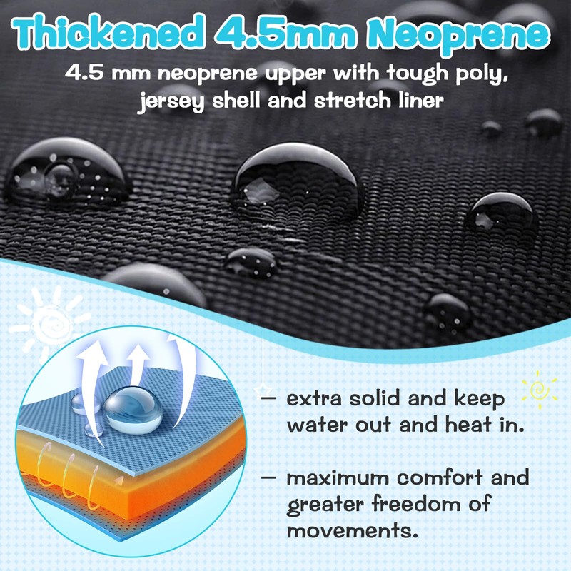 • 【Wear-resistant & 100% Waterproof】4.5 mm neoprene upper with tough poly, jersey shell and stretch liner, along with triple-finished seams (stitched, glued, and taped), make it extra solid and keep water out and heat in