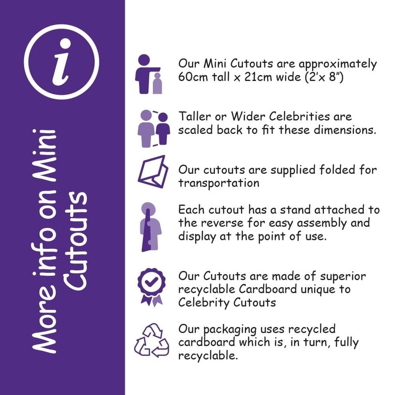 - Our Lifesize Cutouts are the size of the Celebrity – up to 190cm (6'3'') tall and 70cm (2'4'') wide. Our Mini Cutouts are 60cm (2') tall x 21cm (8'') wide. Exceptionally tall or wide Celebrities are scaled back to fit our dimensions.