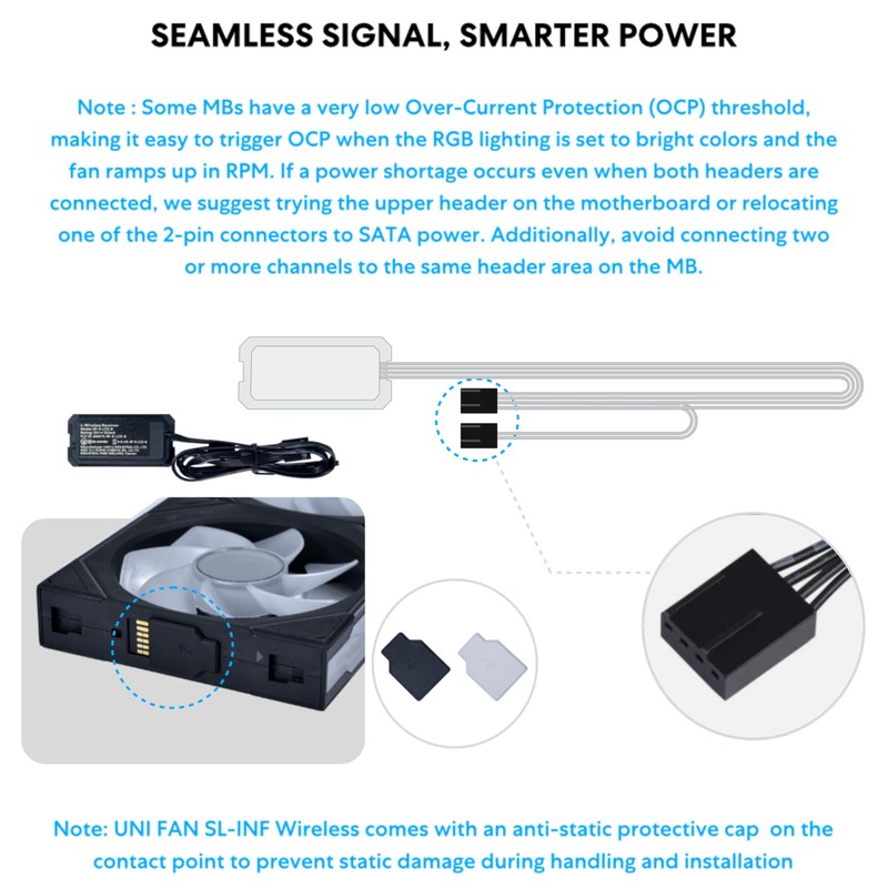 - Redesigned Receiver: Equipped with a new wireless receiver, the fans connect seamlessly to power both blades and LEDs. The updated 4-pin cable ensures compatibility with 12V PWM motherboards, simplifying installation and eliminating connector confusion.