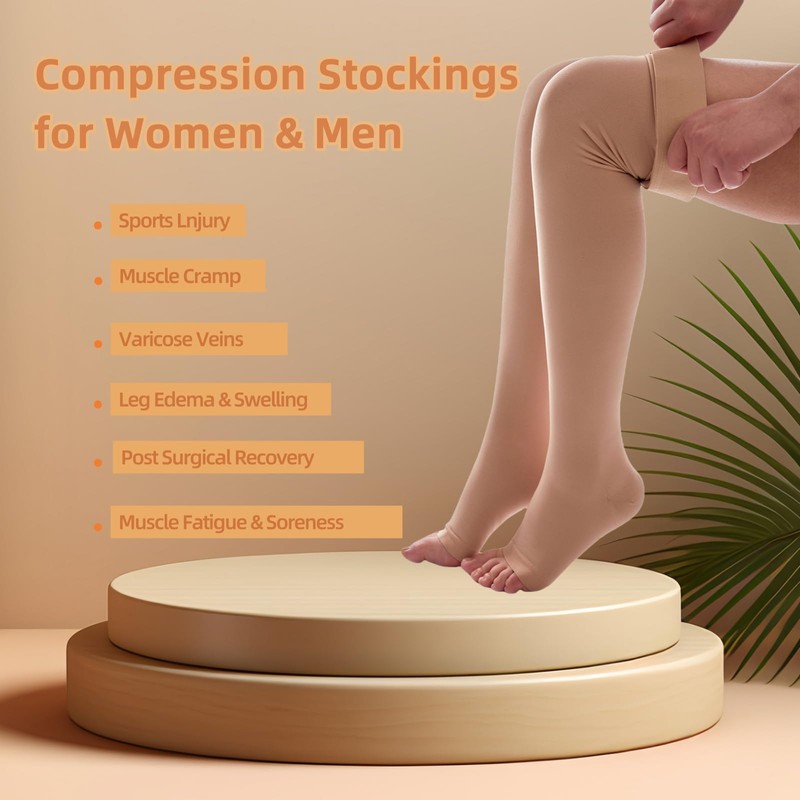 - GRADUATED COMPRESSION DESIGN: The pressure of compression stockings gradually decreases from the ankle to the thigh. This gradient pressure acts like an "external pump", promoting venous blood flow from the ankle towards the heart, reducing blood pooling in the lower limbs and lowering venous pressure. This design meets the physiological needs of venous blood return and is the core difference from ordinary socks. It helps improve blood circulation in the lower limbs, alleviate venous-related issues, reduce swelling and fatigue, assist in postoperative recovery, and provide protection and recovery during sports.