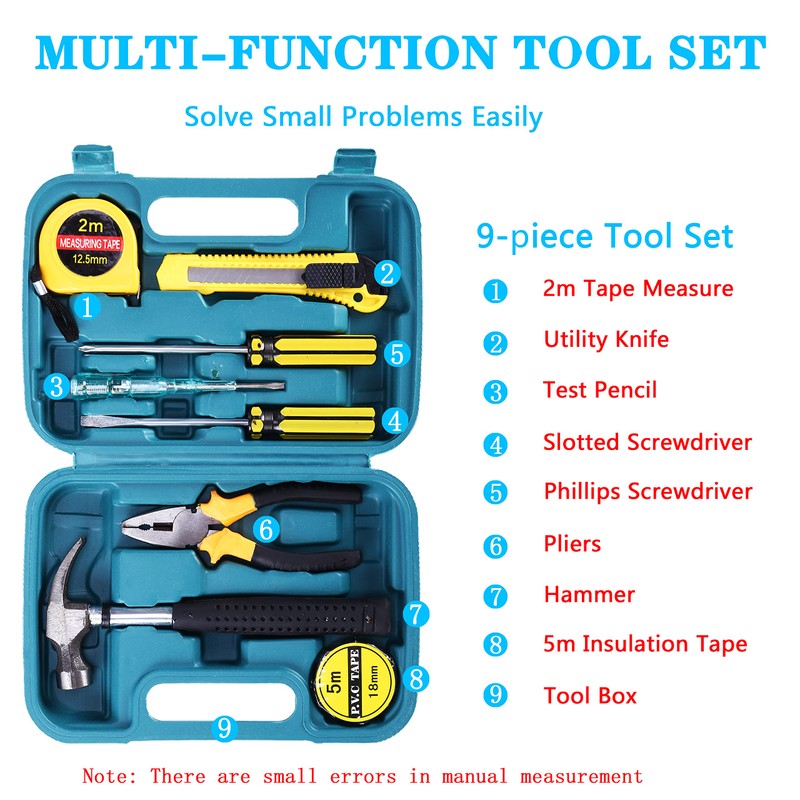 - 🚗 【Car repairs tool box】: Small and compact, suitable for any place, the tools are neat and orderly. Including hammer, pliers, utility knife, tape measure, PVC tape, digital display test pen, 3 screwdrivers. Each kit has a separate location. Clean, safe, convenient, light and strong plastic shell can withstand pressure