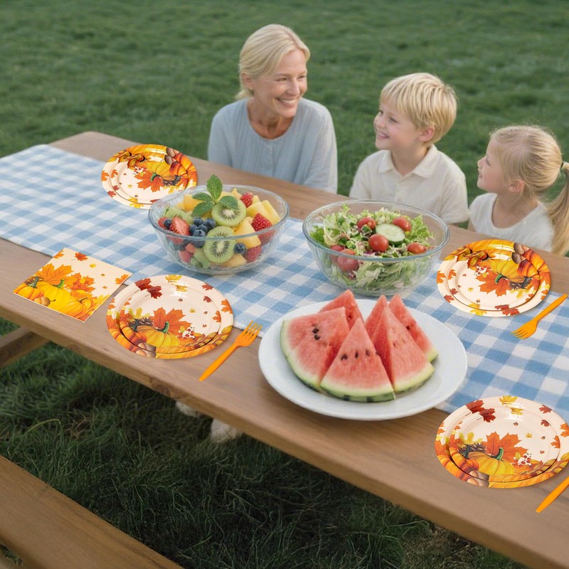 - 【Quality Materials】: This fall party supplies dinnerware sets are crafted from premium materials, these pumpkin maple leaves harvest themed paper plates, forks and napkins are non-toxic, odor-free, and sturdy. Suitable for serving a variety of party treats without folding and tearing.
