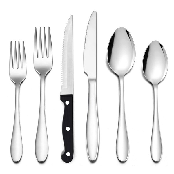 - Stainless steel silverware, 24 piece flatware set with steak knives are made out of quality stainless steel which ensures durability, sturdy structure, rust resistant, prevents you from having to make additional investments