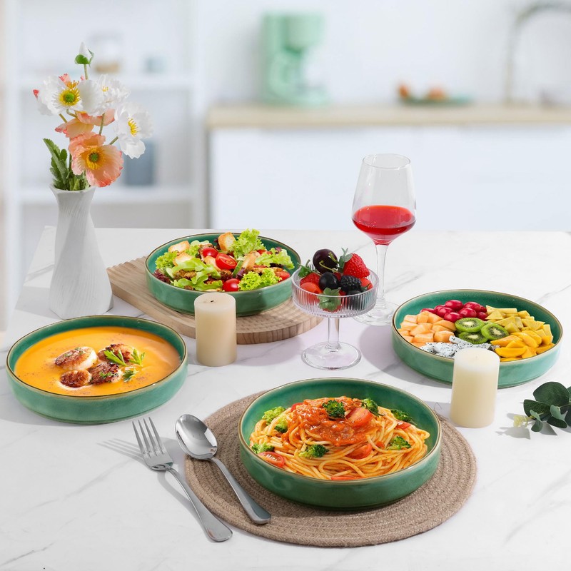 LIANYU 33oz Pasta Bowls, 8.25’’ Wide Shallow Salad Plates Set of 4, Stoneware Ceramic Dinner Serving Bowls for Cereal, Fruit, Soup, Microwave & Dishwasher Safe, Emerald Green