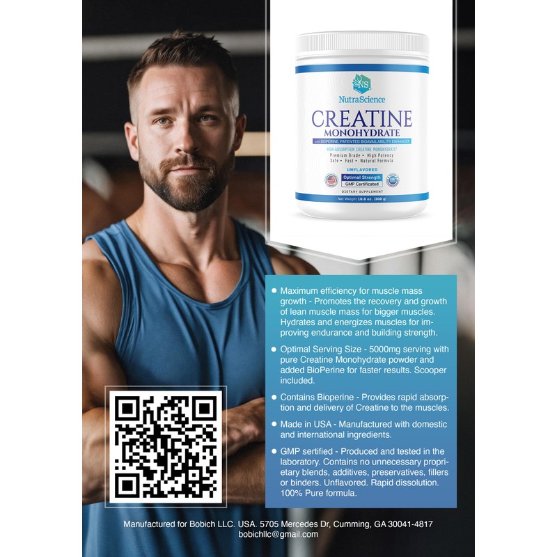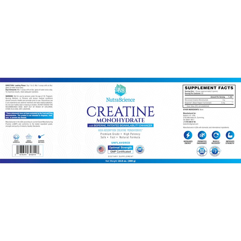 NutraScience Creatine Monohydrate Powder with BioPerine, Supports Lean Muscle Growth and Recovery, 60 Servings, 5000mg Per Serving, Unflavored, GMP sertified, Vegan Friendly, Non GMO