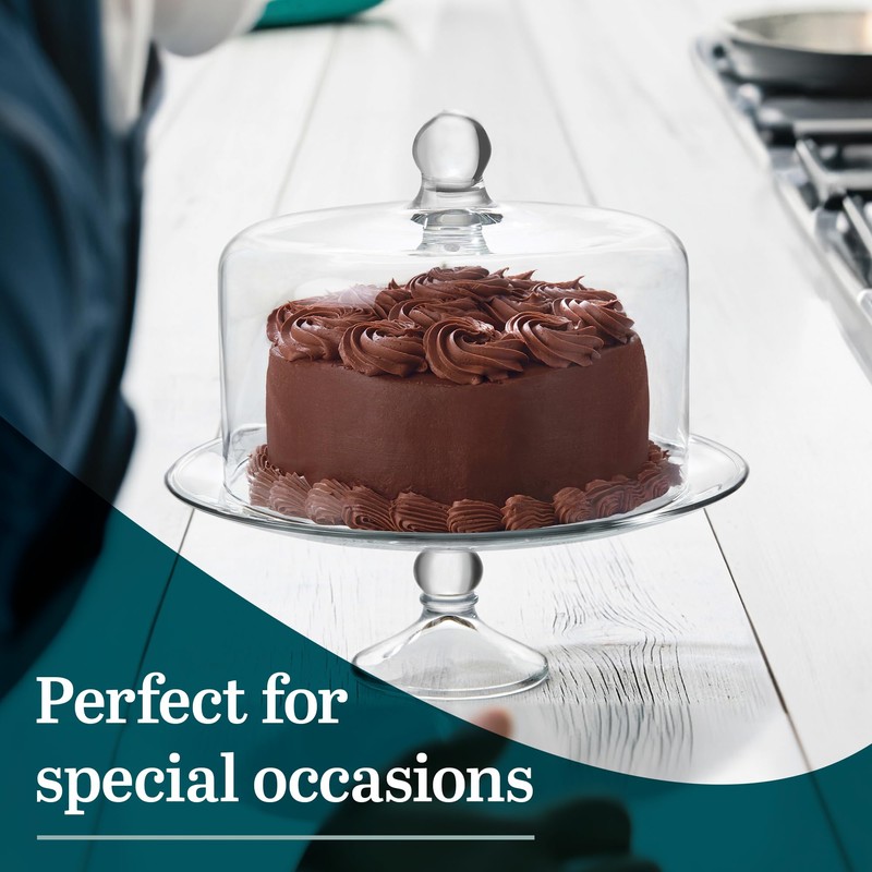 - Cake Stand with Dome: Show off your confectionary masterpieces with our two piece round cake stand with dome set; the elegant cake glass dome adds profile to the table with its curved look