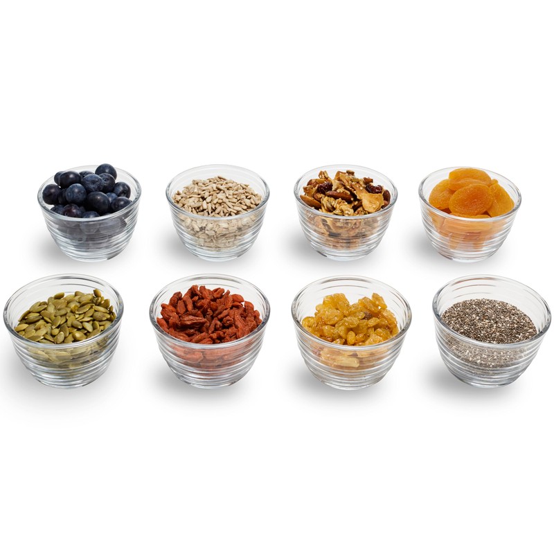 - Includes 8, 3.45-inch diameter glass bowls (2.25-inch height) with plastic lids