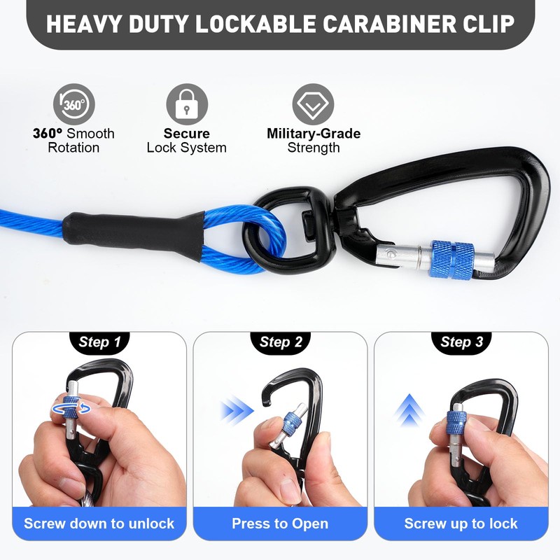 • 60-Second Setup: Clip the aviation-style aluminum screw-lock to trees/stakes, tighten securely, then attach to collar. Heavy duty dog leash requires no tools for tangle-free freedom in your yard or campsite