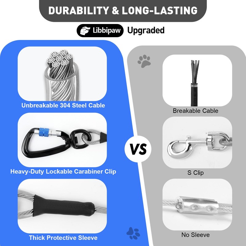- Chew-Proof Steel Core: Galvanized carbon steel dog tie out cable with vinyl armor resists sharp teeth and weather. Reinforced abrasion sleeve prevents fraying for years of heavy-duty use