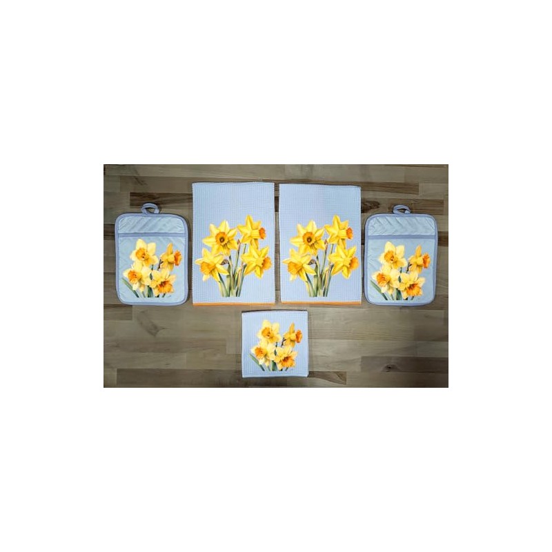 Liberty Flags & Gifts 5 Piece Set - 2 - Waffle Weave Towels and 2 - Pocket Pot Holder - 1 - Wash Cloth - Daffodil's Spring Flowers - DZ006-ORWH5pc, White