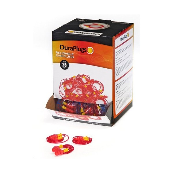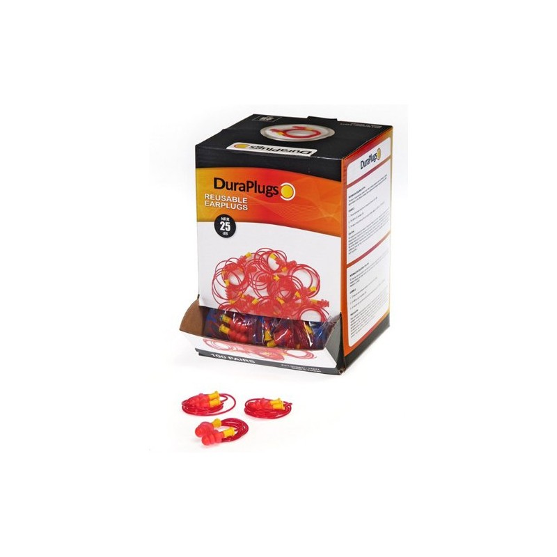 Liberty DuraPlug corded disposable reusable earplug. Unique 3-layers flange enhances sound insulated effect. High visibility color plus bright color cord make compliance checks quick and easy. Firm stem for easy insertion and removal. Washable and reusable. Noise Reduction Rating (NRR): 25dB. Comply to ANSI S3.19.
