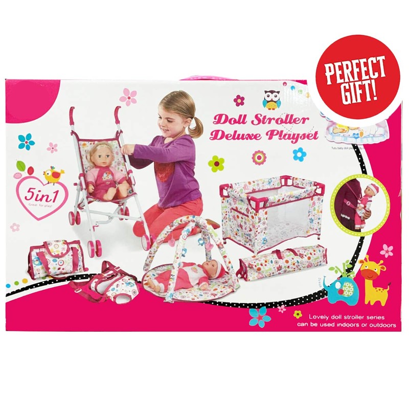 - COMPLETE NURSERY PLAYSET: This 5-in-1 deluxe newborn baby doll stroller playset includes a stroller, baby carrier, playard, play mat, and travel bag, providing a comprehensive role-play experience.