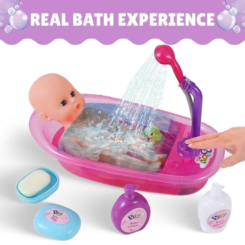 - Realistic bath time fun: Let your child experience the joy of bath time with this adorable baby doll playset featuring a 13-inch realistic vinyl doll and a purple bathtub with a detachable shower spray and many accessories