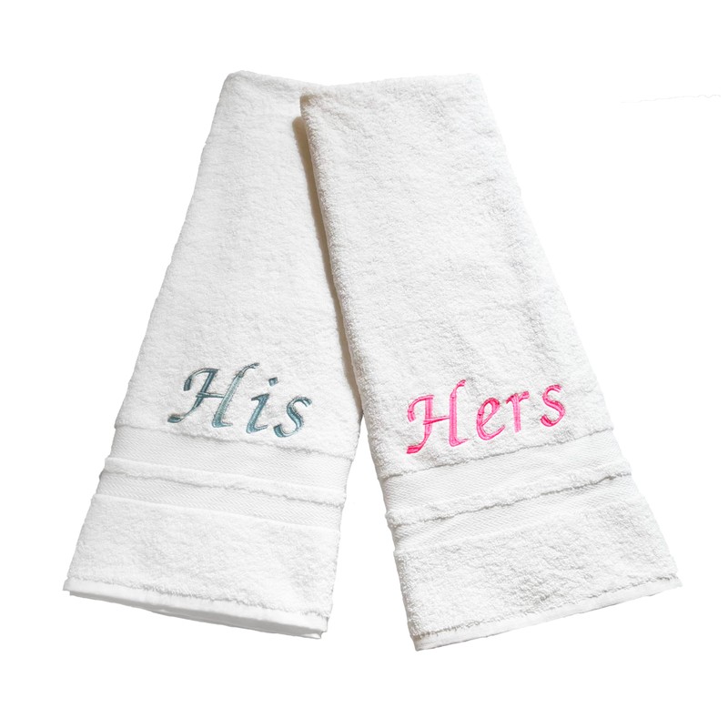 - White Towels can be bleached and won't affect the embroidery. These His and Hers Embroidered Bath Towels Set are a must-have bath piece for any home.100% Cotton, Super Absorbent, Soft Towels.