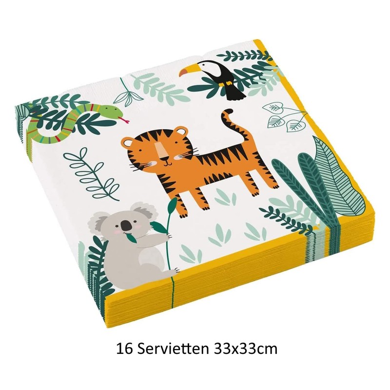- Our 33-piece tableware set in the theme of wild animals jungle animals is perfect for the next celebration children's birthday party or the next outdoor picnic. The set consists of tablecloth, 8 paper plates, 8 paper cups and 16 napkins, all printed with beautiful jungle animals.
