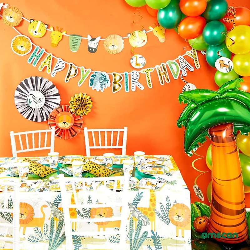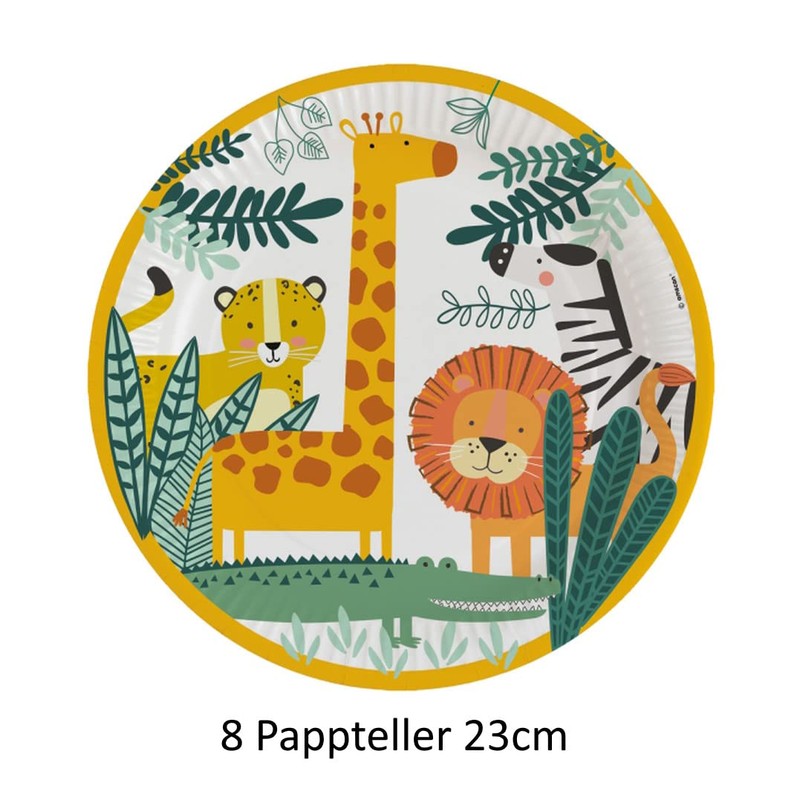 - The wild animals/jungle animals tableware set is practical and perfect for a jungle or wild animal party. The party tableware set will make your table a real eye-catcher. The animal motifs bring the theme to life and create an exciting and adventurous atmosphere. Ideal table decoration for children's birthday, birthday party theme jungle, jungle animals, safari, zoo. For up to 8 people