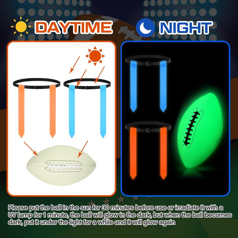- Ultimate Glow-in-the-dark Experience: bright luminescent waist flags and footballs ensure that fun never stops even in the dark; Please place the ball and waist flags in direct sunlight or under ultraviolet light to quickly charge them and make them shine brightly at night