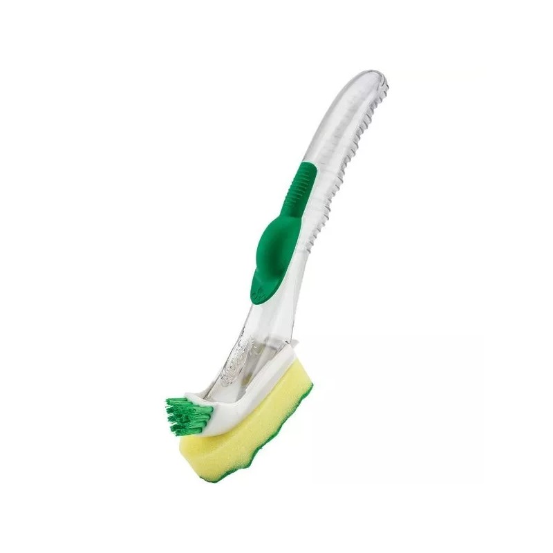 Add your favorite dish soap to scrubbing dish wand with scrub brush. Shaped to fit into corners. Scouring sponges rinse cleanly. Cap-free design eliminates leaks.
