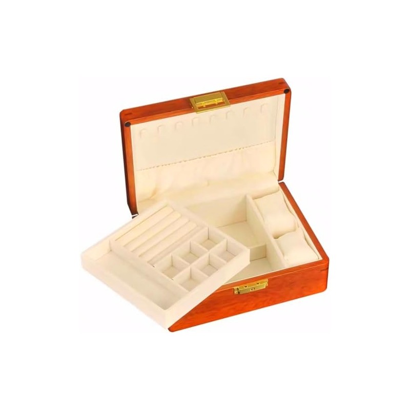 LIBOLXSP ウォールナット無垢材 鍵付き2段式ジュエリーボックス|指輪・ネックレス収納 ビロード内装 コンパクト設計(23×18×8.5 cm)