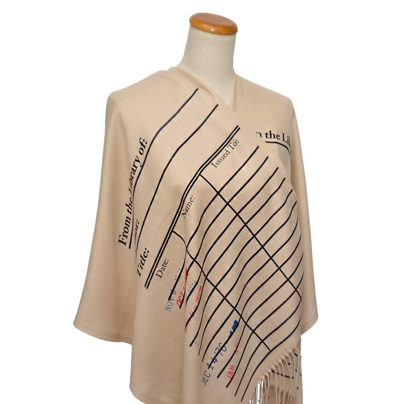 - Printed on soft, beige colored acrylic blend shawl.