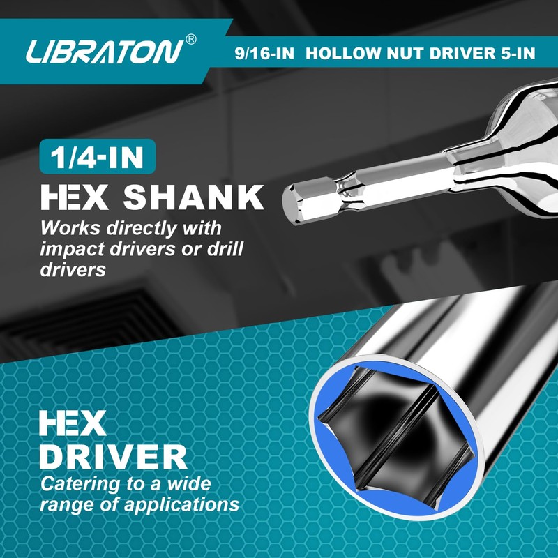 • Multiple Applications - Libraton hollow nut driver design with a universal 1/4" Hex shank, which can be used on chucks, drill bits, driver and screw-gun. It is widely used for fastening or loosening long hex nuts in high places, such as ceiling or ductwork, etc.